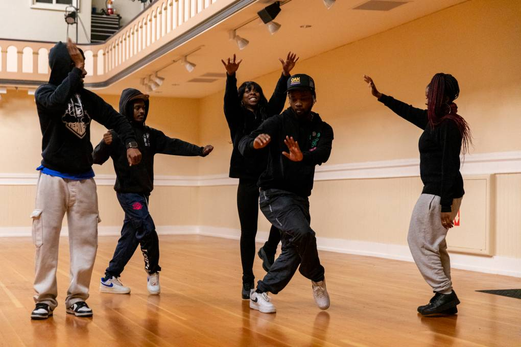 Gary ‘Ice Cold 3000’ Morgan (center) dances with Mud Water Theatre members during rehearsal for ‘Mud Water IV’ at the Bayview Opera House. Created by My-Linh Le, the dance theatre piece will premiere at Dance Mission Theater on Nov. 18. (Juliana Yamada/KQED)
