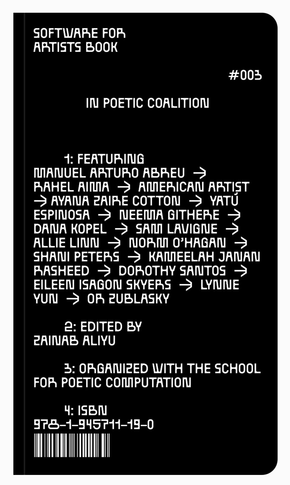 “This publication is a coalition — it brings together experiences of combined action. With a focus on labor organizing within the arts and tech industries, In Poetic Coalition explores the potential of creating alternative networks of education and challenging the material conditions that prevent us from enacting new realities with dignity and security. When we defy existing models for institution-building, what possibilities for gathering can materialize and what kinds of learning and unlearning can we practice together? Released alongside Pioneer Works’ eighth Software for Artists Day and the School for Poetic Computation’s 10th anniversary in November 2023, we invited educators, labor organizers and artists exploring experimental learning initiatives to be in solidarity and conversation with each other. Through coalition, we can build the worlds that we know to be possible.”