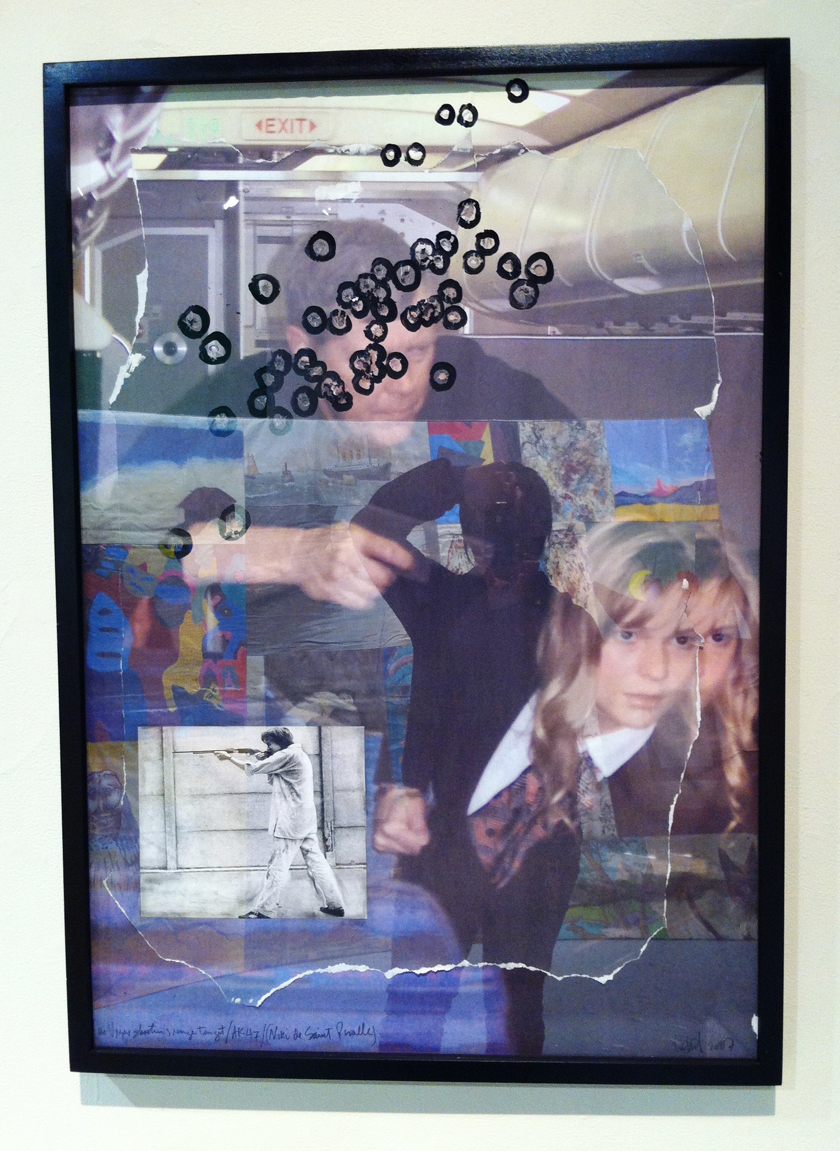 One of the more psychologically moving works was Tony Labatβs bullet laden piece titled, TIR (After Niki). It arrests your sense of security and the longer the gaze the more provocative it becomes to the baser part of human nature. The inability to look away, as much asΒ you mayΒ want to. I was unable to do so. I returned multiple times to this particular piece during my visit. What exactly is the message LabatΒ has for the viewer? How does the mind fathom and reconcile the implied actions? The suggestion of killing the pretty blonde woman coupled with looking at actualΒ bullet holesΒ circled by a permanent maker around the killerβs head is allegorical of the culture we find ourselves in. We witness a moment but within that moment, the viewer is seeing what the mindβs eye may be already doing – killing the perpetrator. Labat has done that for us. Or, has he?