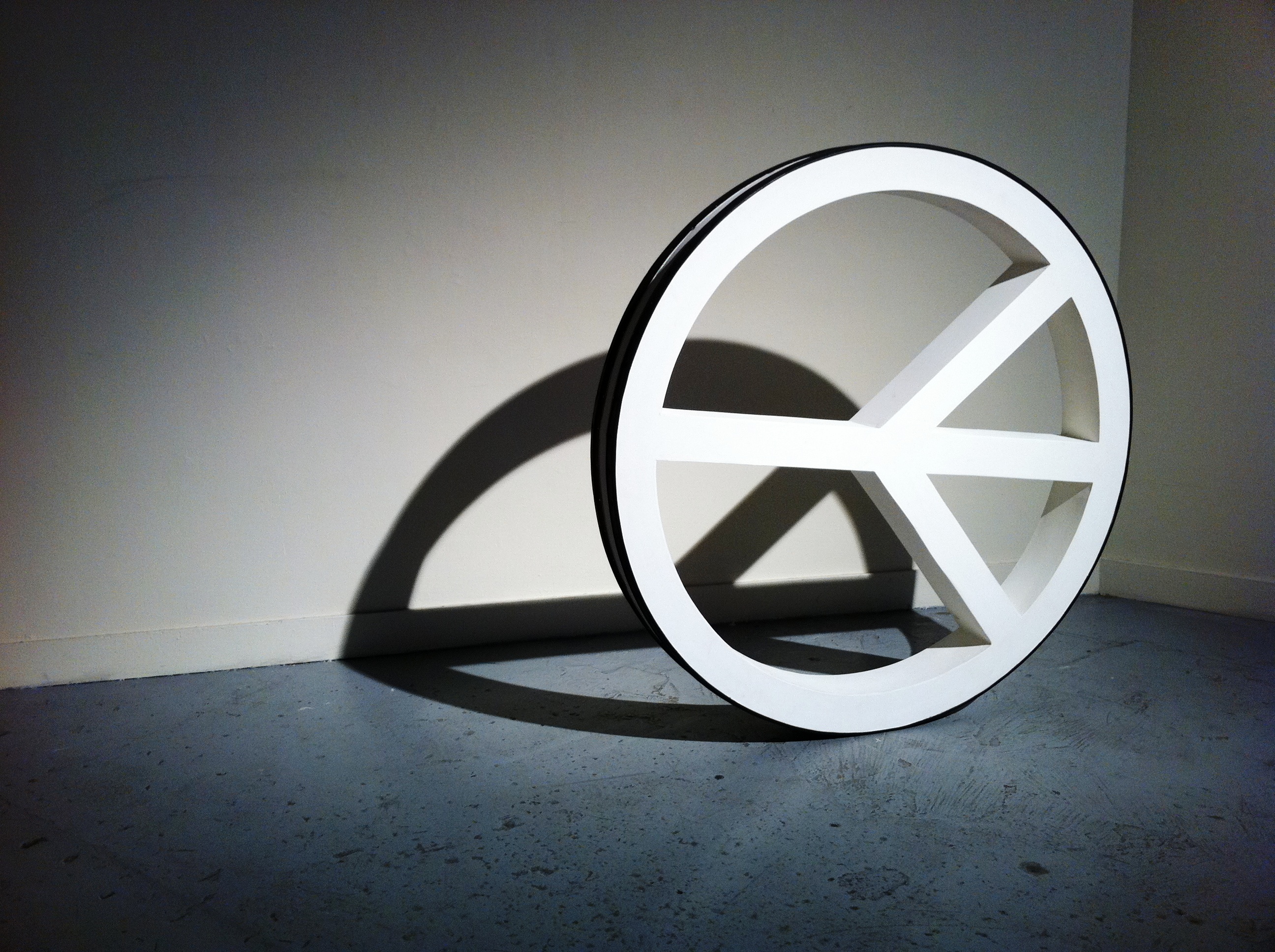 Peace Roll, another piece by Tony LabatΒ is accompanied with a DVD loop. In the video installation, the viewer watches a woman walking through Golden Gate Park and various parts of San Francisco rolling a jumbo gigantic peace sign, which is actually a sculpture in the exhibition. Iβll provide a bit of scale here. Iβm 5β1β and the sculpture, its diameter, is 7β taller than me. Although height doesnβt matter, I wanted to give you a bit of spatial context when imagining the sculpture. Aside from its obvious meaning, the footage was the most interesting aspect of the work. Watching the people watch this young woman rolling a peace sign all over the City reminds me of memory and what is memorable. Again, going back to the idea that the contents of this show are far from something fleeting, it is an act, a gesture that remains engrained another viewer within an environment. Talk about reverse psychology!