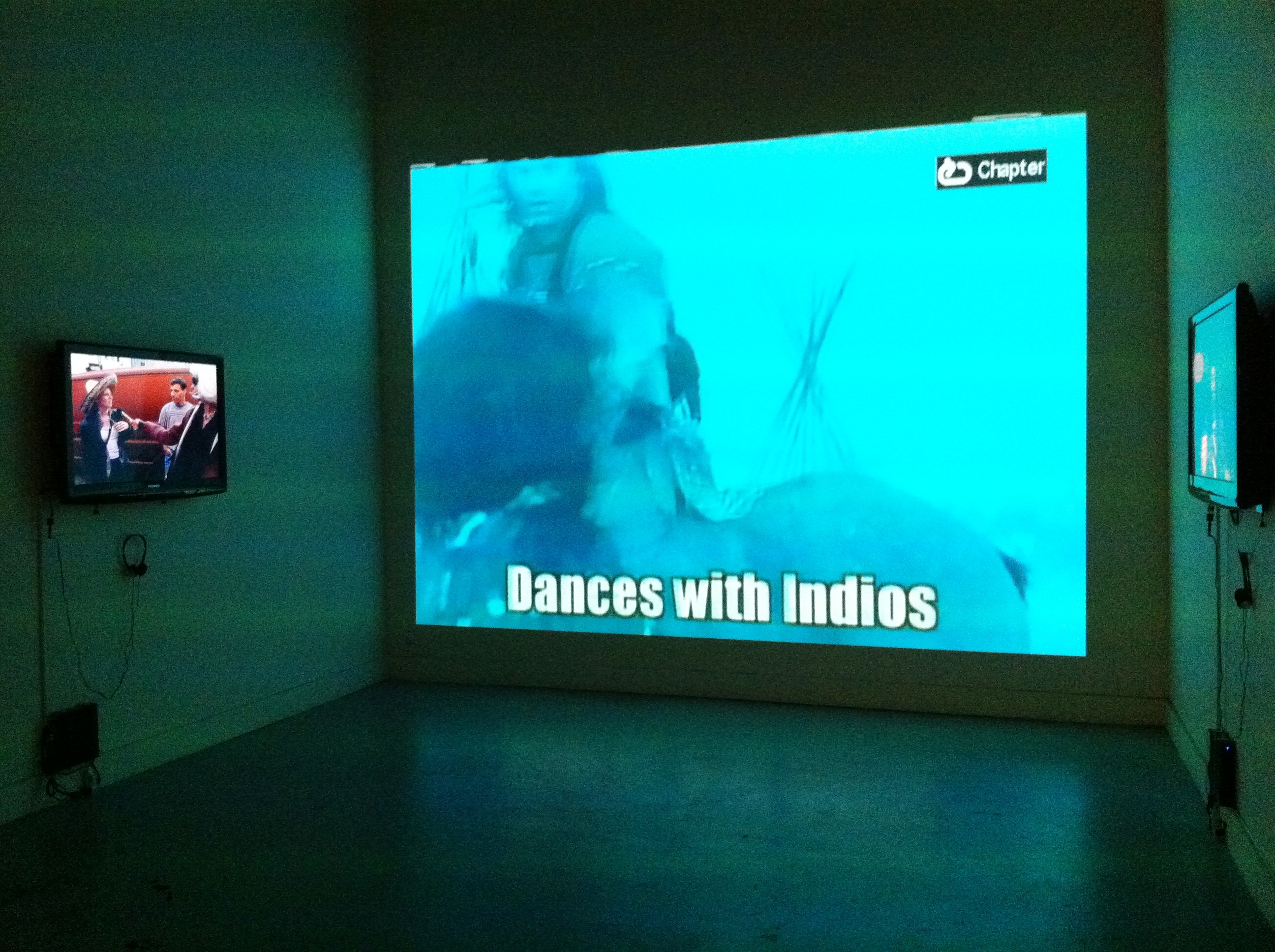 Guillermo Gomez-Pena and La PochaΒ NostraΒ video installations located within a room off to the side of the main gallery was my last stop. It involved watching a pastiche of vintage and semi-contemporary movie clips that provide the viewer with American perceptions of Latin American/Mexican culture.Β Nestled to the sides of the larger screen, you are bombarded with impromptu interviews with people on the San Francisco streets being asked to imitate a Mexican or an uptight βwhiteβ person (sometimes, for money since many people will all of a sudden become gregarious for a buck and some incentive). The long-lasting effect is on the exhibition patron – the viewer. What exactly does the viewer get from this experience? Besides a cringe worthy moment, there is a sheath of embarrassment in the not so random act being a witness to this social experiment and performance. Ironically, it may have been a blur to the individual asked to participate but not to the person on the receiving end of the message. The gallery patron is left with someoneβs knowledge and or experience, which in many cases causes discomfort.