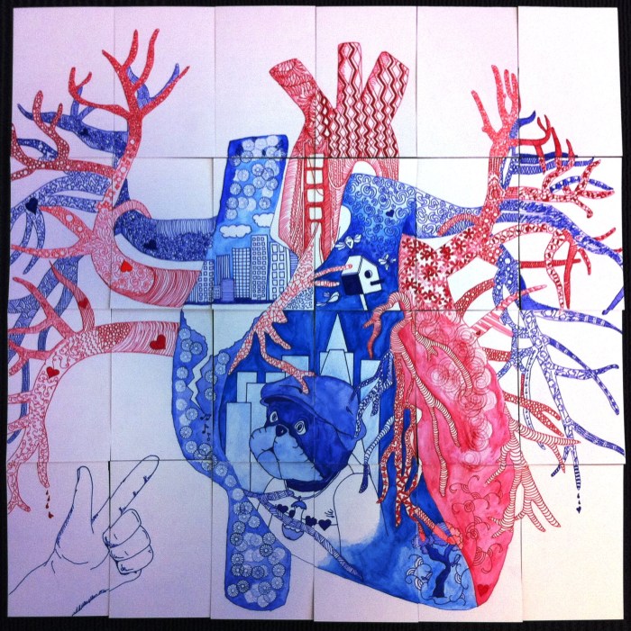 Honestly, I was NOT expecting anyone to respond. As I mentioned to someone else, I thought, if lucky, maybe 2-3 people. Seriously, even though I have Twitter and Facebook friends, I wasn’t expecting to receive a slew of home mailing addresses. I had the idea brewing in my head and crossed my fingers. Pleasantly surprised, there were 17 willing participants out of 24 total recipients. I proceeded to cut 4×6 cards, piece them together, draw the human heart, and draw! I worked on this for a few days and had different drawing methods (i.e., drawing randomly on cards, patterns based on my mood, images that had something to do with where I’m from – San Francisco, CA). The result: A blue and red heart made with, well, a lot of lovingly made doodles. Yes, when I was a kid, I was a doodler/scribbler extraordinaire and wanted to re-visit those days to remind people that they’re loved and cared for.