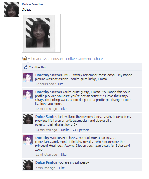 My Mom has impeccable timing (and has given me an excuse to talk about Lo’s work). She felt the need to change her profile picture and let me know. She was sensitive to the fact that I may wonder why our picture (a picture my cousin took of us a few months ago) is no longer her profile picture. Whether this is true or not, is irrelevant. The fact that she was sensitive enough to write was really thoughtful. Do I care if she changes her Facebook profile? Of course not!! That type of decision is left to her own volition BUT the sensitivity expressed was pretty priceless if you ask me. As a matter of fact, the comment thread resulted in this quite heartfelt and endearing exchange. Truthfully, there have probably been hundreds of thoughtful exchanges with friends and family that I have discarded. Now, I’m not going to encourage everyone start print screening and cropping their threads and putting them into scrapbooks (what a surreal thought, eh?). However, I will say this, why is it that art comes to the rescue when people forget that they’re people (living beings for goodness sake)? Why is it becoming so natural to pay less and less attention to the things we say, express, and how we act? Lastly, most importantly, why on earth does my mother continue to use license plate language when leaving me comments or text messages (sorry, Mom, you know how I feel about letter and number combinations in written form)? Only joking…