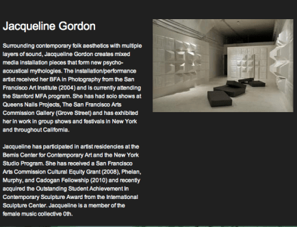 Sonami’s selected artist for the Spread exhibition was artist, Jacqueline Gordon. Yet another amazing artist that does incredible work exploring architecture and how sounds (whether from the outside coming into a designated space or synthesized sound) affects both the space and the listener. Hoping to see her featured on artist site, The Limner, soon. You can view her upcoming graduate show here.