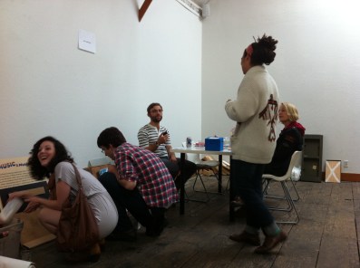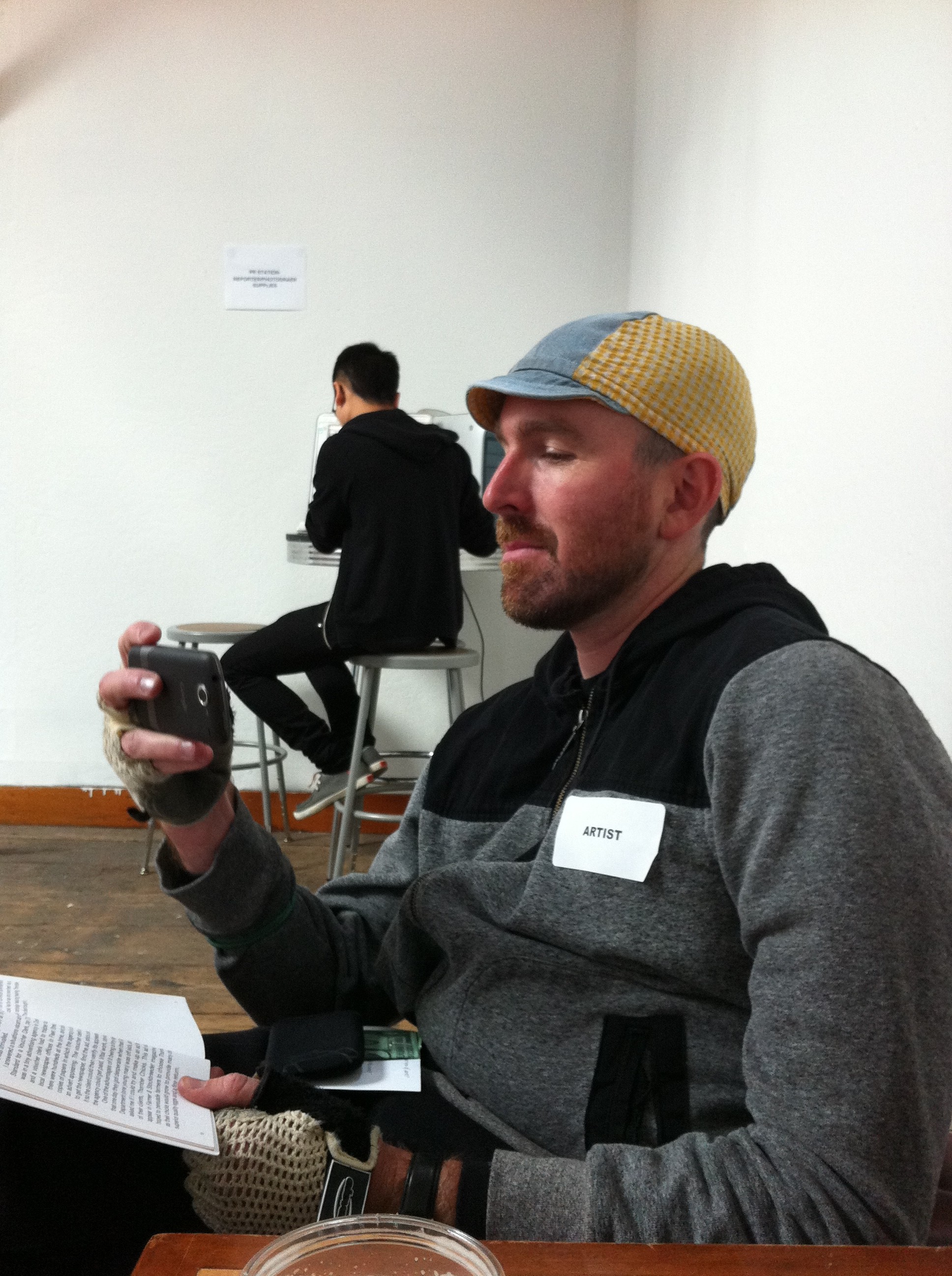 My first interview was with an artist. One of the most memorable answers from our conversation entailed his breadth of knowledge regarding performance art (i.e., Tom Marioni and Tino Sehgal – I was impressed). Obviously he was well aware of relational aesthetics. Art certainly is an intellectual interest but, admittedly, he came for his friend and thought it would be a great experience. Another interview with friend (Aimee Espiritu, real-life artist and educator) who took on the role as PR answered the questions as herself AND her role!! The ways in which her answers differed showcased her real life PR skills as she doled out the art world vernacular combined with personal reflection.