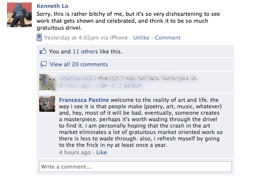 Since virtual life has been on my mind lately, I figured looking at social networking was apropos to the overall discussion. Quite honestly, it’s impossible to see, know, and experience the entire virtual world. It’s constantly expanding and growing and at such a rapid pace. Like others, it’s much more realistic to read and follow sites and/or blogs that hold one’s interest. Some time ago, I wrote the post, Paying my Respects to Kenneth Lo. He’s a phenomenal Bay Area artist and I’m a huge fan of his work. His Facebook statues regarding the arts (amongst other updates) are always these pearls of wisdom and truth so I couldn’t help but share one of his many witty updates. Although he has no intention of stirring emotions, his eloquent points always draw friends into a discussion (via comment thread) filled with humor and candor. Last week, he posted the status, “Sorry, this is rather bitchy of me, but it’s so very disheartening to see work that gets shown and celebrated, and think it to be so much gratuitous drivel.” I agree but it takes a brave soul to bring up such a point. When one feels compelled to re-visit an artist work over and over again it’s because the work resonates, which is a great thing! This happens all the time with music, film, performance art, etc. Yet, bad art (whatever that means to you) does exist. Being the die-hard optimist, I’ve said time and time again that the negative is just as valuable as the positive. Believe it or not, there is art I don’t like or don’t value (personally) BUT I try to understand its message or lack thereof to better understand my own notions and ideas of art.