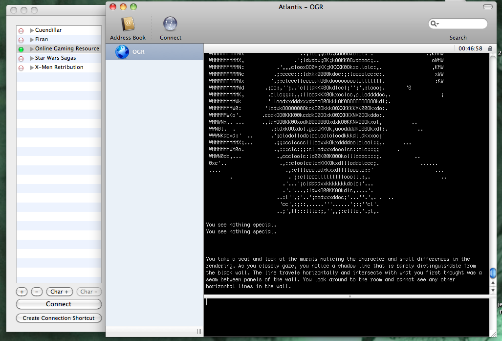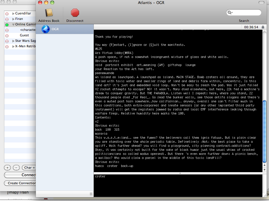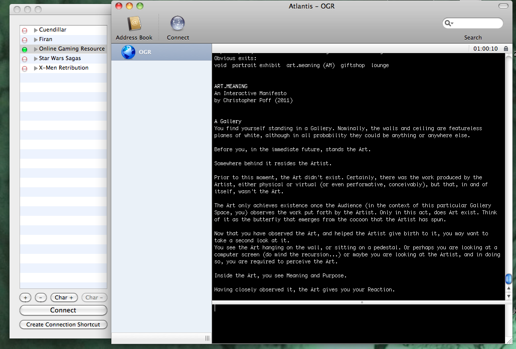 Similarly, Duque’s work reflects how one builds within a Multi-Shared Hallucination or Hack (MUSH). His virtual environment allows users to create stories based on their command choice. Christopher Poff’s work, Art.Meaning (AM), necessitates a participatory discourse on the philosophy of art with a similar multi-user interface. The game requires commands be entered into the game environment to run subsequent text. Sample text from the Art.Meaning (AM) manifesto appears as follows: