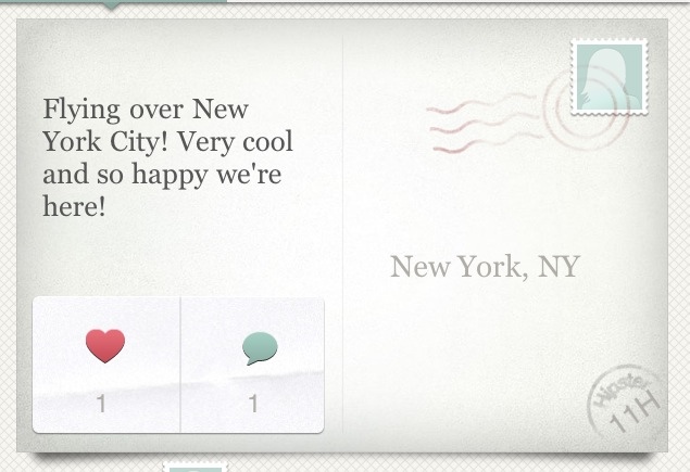 Although I’m not too particularly fond of the name, iPhone application, Hipster, offers the end user the ability to send postcards virtually. In a matter of seconds, I was able to create a nifty postcard of our descent onto La Guardia Airport! Once you select a photo, you pick your postcard theme, flip the postcard around, write your loved one a message (yes, there’s a character limit), and send! Easy but, unfortunately, you can’t send it unless the person is on Hipster as well. Or, you can publicize it on Facebook for everyone to see. The developers still need to work on making this app a bit more versatile (i.e., the ability to send postcards to friends directly from the phone’s contact list!) and I wish they would change the name. Otherwise, they’re onto something (being that they partnered with Foursquare to make this app happen). Here’s what the back of the postcard looks like…