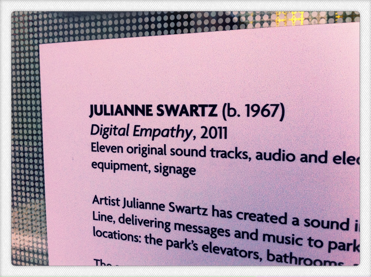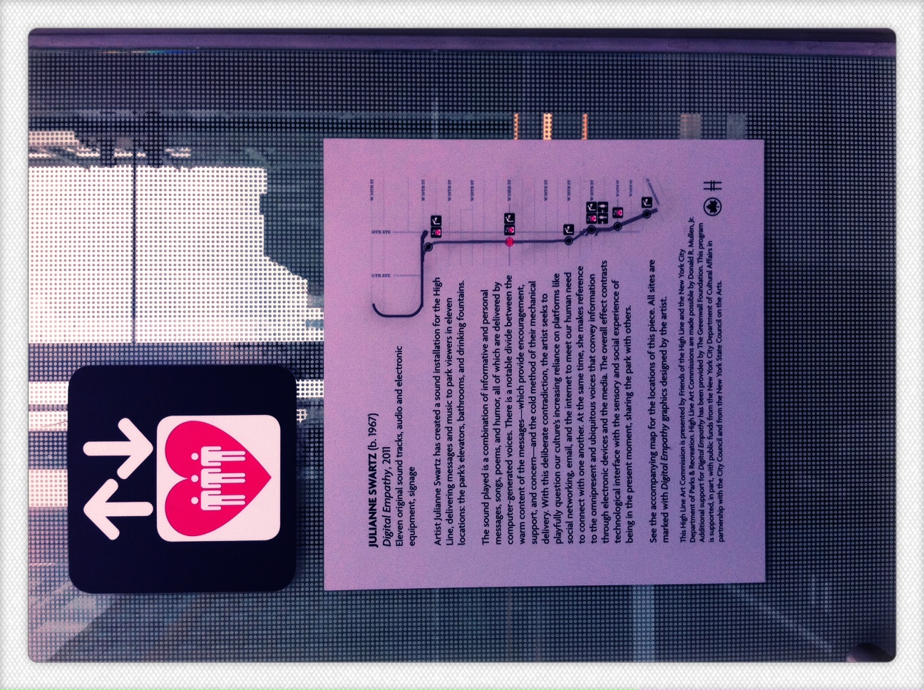 With a visit to the High Line so early in the trip, it was a thrill that the first physical cue that indicated I was in a completely different environment was installation art by Julianne Swartz. Entering the High Line in the middle, one must take an elevator to the park. Currently, Swartz’s work, Digital Empathy, is a sound piece that involves poems, personal letters, and song lyrics recited by computer-generated voices. At first, walking in the elevator, you hear these intimate messages but the monotone and seemingly cold voice with no inflection makes the message sound eerie and unsettling. After reading the work’s description, I felt compelled to go up and down the High Line looking for the signage to hear a voice and listen. Digital Empathy is a sobering reminder that communication delivered in an unfamiliar way makes us listen carefully and fastidiously. Yet, isn’t that strange, that something unemotional stops and makes our ears and the rest of our senses vigilant? Are the sounds of our own voices not enough? Swartz certainly made me wonder.