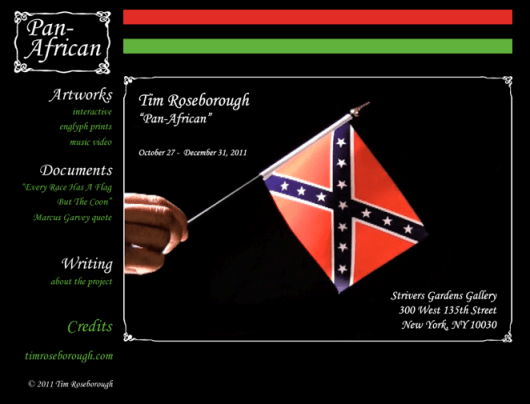 It was a real treat to see Tim Roseborough’s work on exhibit in Harlem during my vacation. His latest work, Pan-African, looks at the Pan-Africanism movement through new media. With his rendition and video of controversial song, “Ever Race Has a Flag but The Coon”, and re-contextualization of the song lyrics in Englyph, this intelligent work forces provokes one to ponder the meaning of identity and solidarity.