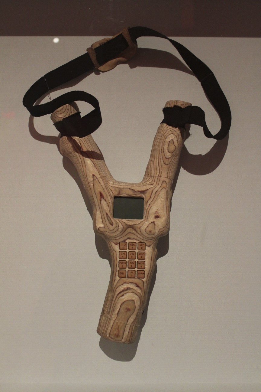 SMSlingshot was made from the following: high-frequency radio, Arduino board, laser, batteries, plywood, and ash wood. The SMSlingshot marries a traditional weapon with text-messaging technology, projecting digital information onto building facades and other surfaces and turning them into public screens. The battery-powered device is a wooden slingshot with a display screen, keypad, and laser. Users type text messages and then release the slingshot to “blast” them onto nearby surfaces, where they appear within a splash of color and linger as long as the writers decide: at the same instant, the text is transmitted globally via Twitter. For the designers, the SMSlingshot is a tool for reclaiming and occupying increasingly commercialized urban space.