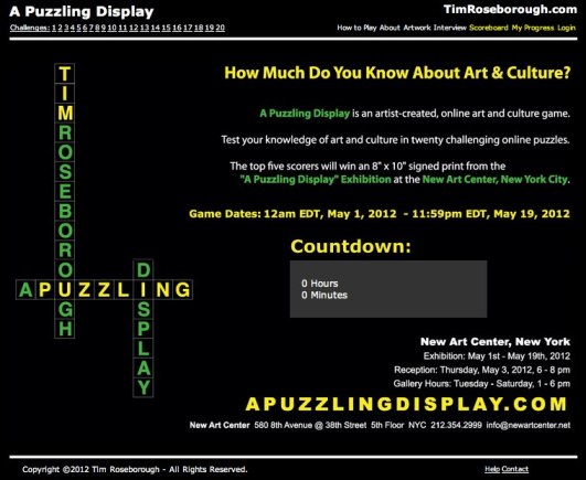 “A Puzzling Display” is a new artist-created online arts and culture game, where registered participants compete and test their arts and culture knowledge. Inspired by the annual “puzzle hunts” hosted by institutions such as MIT and Microsoft, Silicon Valley digital artist Tim Roseborough has created “A Puzzling Display”: an Internet-based set of 20 intelligent and challenging interactive puzzles covering topics such as art history, music, film and culture.