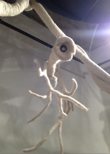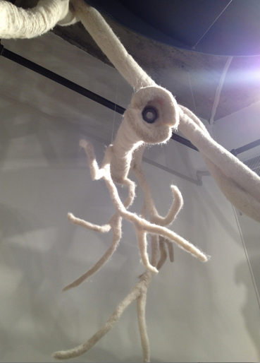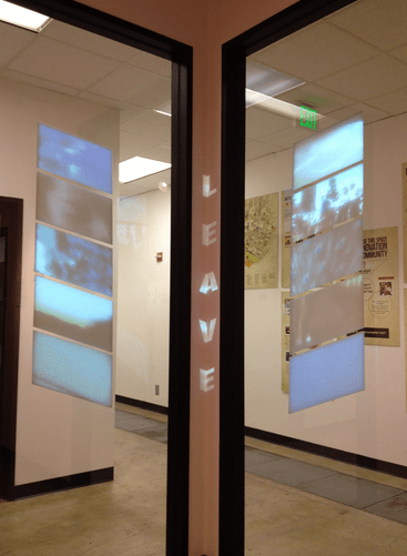 Karrie Hovey and Elise Ficarra (along with Evelyn Ficarra) created a large-scale sculptural piece tmade up of incredibly organic shapes and forms that wrapped around the spiral staircase near the Intersection for the Arts gallery entrance. Walking on the spiraling stairs, forms of deer, antlers, and branches made from felt come into view. Translucent words were sprinkled throughout, and sounds from nature emanated from embedded speakers. The sense of hearing something natural against concrete and metal was reminiscent of the urban landscape where humans try desperately to preserve a sense of the natureal with our rooftop gardens atop corporate buildings and parks surrounded by cars. Hovey and Ficarra’s piece harked back to days when people found themselves outside of the home learning more about life through the written word and their physical environment rather than through a virtual world.