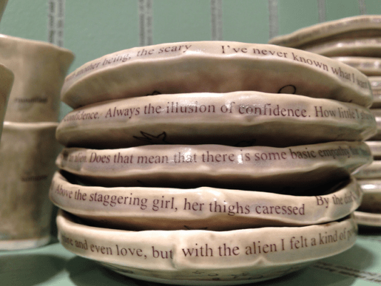 Lastly, audience participation played an integral role in the collaborative work of Liz Worthy and Jenny Bitner. As an exercise in relational aesthetics, Worthy and Bitner take on the idea of Sunday tea complete with friendly interaction. Yet, within the physical space and the objects, such as the tea cups, the table, the dishes, and the cookies, the piece calls upon something deeper from the participant – an intimate moment. Whether the intimate moment was with a friend or one of the artists, an exchange rooted in a reading of Bitner’s piece,Confession expands the idea of intimacy in that it asks the reader to question their own relationships both “real” and “online”. The work uses a sense of whimsy and playfulness as it asks participants to ponder their own idea of interaction and engagement with others; in this space, the viewer is asked to engage with objects and people in real time in actual physical space.