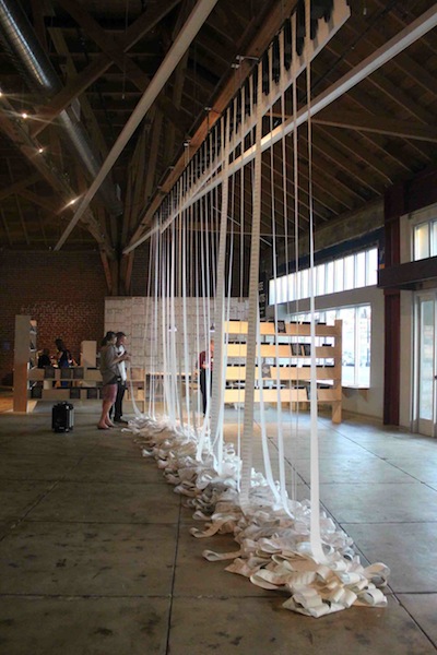 As a 2012 ZERO1 biennial artist, Baker installed this iteration of Murmur Study in the back of the renovated and large exhibition space known as the ZERO1 Garage located in Downtown San Jose. The mottled, weathered, gray concrete that once served as a car repair shop now welcomes the footsteps of arts and technology patrons as well as curious newcomers. Baker reinvents micro messaging through circuitous wires and re-programmed thermal printers#. Far from reach, the printers are hung high on an exposed beam. Like soldiers at attention, they hold their post through the day and night without rest. Yet, the slow release of printed messages such as “That awkward moment when you’re eating fast food and some show about ‘how unhealthy the world is today’ is on tell…::whoops::?” provoke us to respond. Yet, the installation relies only on observation as the thin receipt paper cascade down and messages eventually reach eye level. On the gallery floor, the paper accumulates resulting in piles that resemble white discarded shoelaces. During the rush of opening night, bodies passed curiously by the work. As visitors passed the installation, the papers slightly billowed and reminded us of their presence.