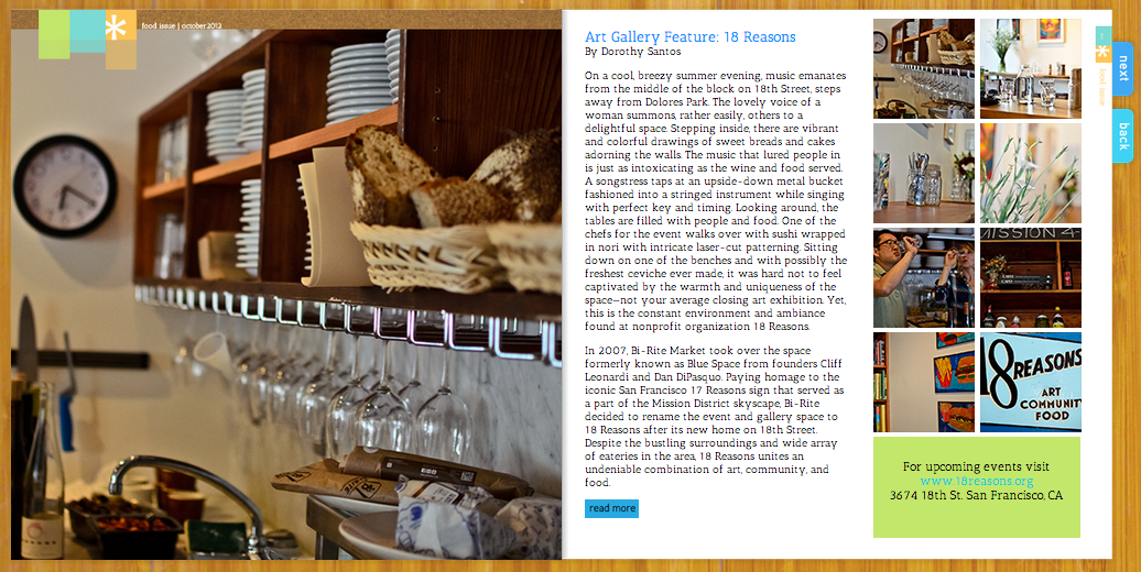In 2007, Bi-Rite Market took over the space formerly known as Blue Space from founders Cliff Leonardi and Dan DiPasquo. Paying homage to the iconic San Francisco 17 Reasons sign that served as a part of the Mission District skyscape, Bi-Rite decided to rename the event and gallery space to 18 Reasons after its new home on 18th Street. Despite the bustling surroundings and wide array of eateries in the area, 18 Reasons unites an undeniable combination of art, community, and food. With the objective of creating community through food and art, the programming literally and figuratively caters to the diverse San Francisco community.