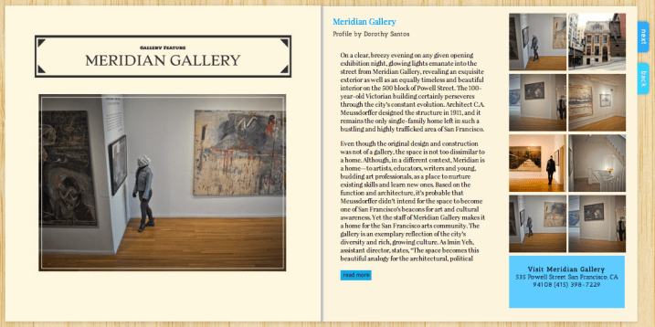 Even though the original design and construction was not of a gallery, the space is not too dissimilar to a home. Although, in a different context, Meridian is a home—to artists, educators, writers and young, budding art professionals, as a place to nurture existing skills and learn new ones. Based on the function and architecture, it’s probable that Meussdorffer didn’t intend for the space to become one of San Francisco’s beacons for art and cultural awareness. Yet the staff of Meridian Gallery makes it a home for the San Francisco arts community. The gallery is an exemplary reflection of the city’s diversity and rich, growing culture. As Imin Yeh, assistant director, states, “The space becomes this beautiful analogy for the architectural, political and critical history of San Francisco, and the home is a container for Meridian Center for the Arts’ numerous contributions and relationship to San Francisco’s Past and Future.” But the Financial District is not necessarily known for its alternative art spaces. With its beautiful hardwood floors and three levels of visual arts, Meridian remains one the most unique art spaces in the city. From its location to its architecture, it proves itself as a perfect place for cultivating ideas and serves as fertile ground for artists.