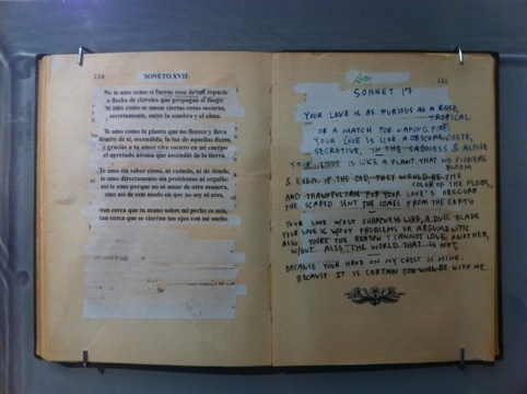 Technology often conjures up images of mobile devices, machines, and programming. Yet, technology, according to Wikipedia, “…is the making, usage, and knowledge of tools, machines, techniques, crafts, systems, or methods of organization in order to solve a problem or perform a specific function”. With all the taxonomies and ever evolving nature of art, new technologies present themselves everyday. Yet, the barrage of images in the media are not the only thing that inundate us. Language is ubiquitous. What limitations do we experience when we’re forced to use only 140 characters? What does this impact the way we communicate? Or how do we make sense of the words that make it into our vernacular in such a fast paced environment? In Other Words, showing at the Intersection for the Arts, showcases the work of contemporary artists interpreting our collective relationship and understanding of language. Kevin Chen, Intersection for the Arts program director, gathered artists looking at the written word to extrapolate human behavior and creativity, re-configurations and semantics of language, the tactile nature of typography and script, and the physical placement of text.