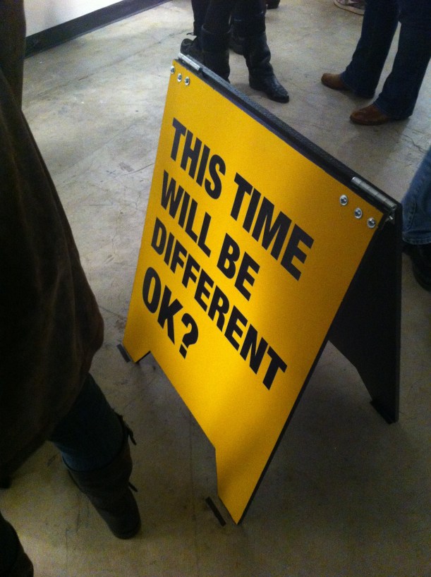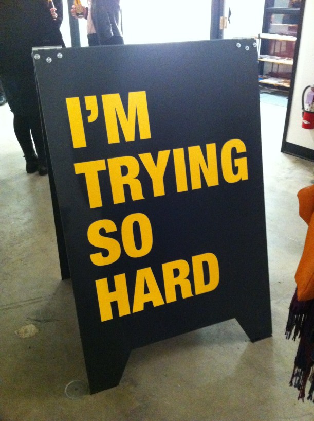 Lastly, physical engagement with text in space is seen in the work of Meryl Pataky. Your Company (2012) and Say It Out Loud (2012) made with steel, brass, and computer parts displays our digital waste and re-configures the refuse into physical three-dimensional language. The shapes and bends of the material simulate how we may perceive the world in which we work and find ourselves confined to. Pataky creates a bit of mysticism in his deconstruction. We see the words but don’t necessarily have to understand the etymology. We see them in space and that is all that matters. In contrast, Susan O’Malley sprinkles plaques throughout the venue coupled with larger sandwich boards adorning the center of the gallery space. O’Malley wants to lead the viewer to an experience of art through a playful hide and seek of text which serves as a metaphor to the hidden meanings of language we encounter on a daily basis. Overall, our relationship to language is multi-faceted and constantly evolving as seen in these works. Chen’s selection of artists not only illuminate the complexity of language but evoke our senses and reactions to them.