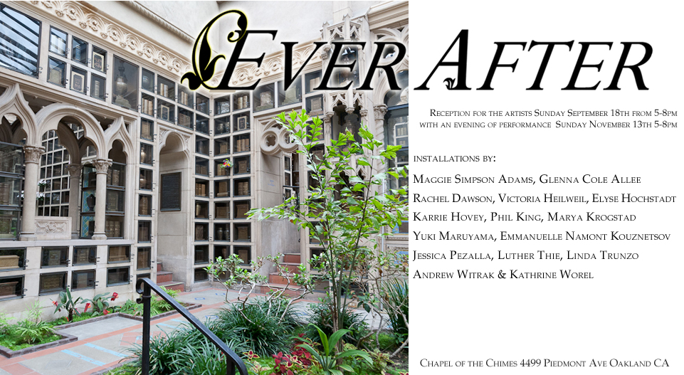 Most stories end with “happily ever after” — but the stories being told by artists in this show are using Ever After as a starting point. Poignancy, playfulness, and sharp insights into the nature of the Eternal are the common threads used to weave a series of site specific mini-installations through chapel niches. From the minimal to the Baroque, artists use these unique spaces to reflect upon notions of ritual, remembrance, loss and celebration with critical alacrity and humor.
