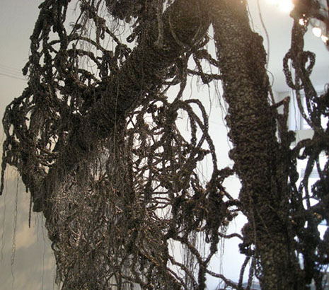 In ‘Blanket Policy’, Labat re-uses thrift store paintings, stitches them together to create a tent and aptly creates a ‘blanket statement’. Ironically, the tent is restrictive, cold, and with extreme angles, and mimics a traditional looking tent yet doesn’t create a cohesive whole. Circling the piece, I felt compelled to go through it. The longer I viewed it; I couldn’t help but look at particular paintings, wishing away other ones because they seemed ridiculously incongruous with the rest of the paintings. There was a compulsion to rip away what I felt didn’t belong. Even though each painting was stitched to become one piece of fabric the radical differences in style, composition, and tone brought unease (even within such a tightly created structure). Human beings organize and govern themselves but there are those moments of friction and action that go against the whole…