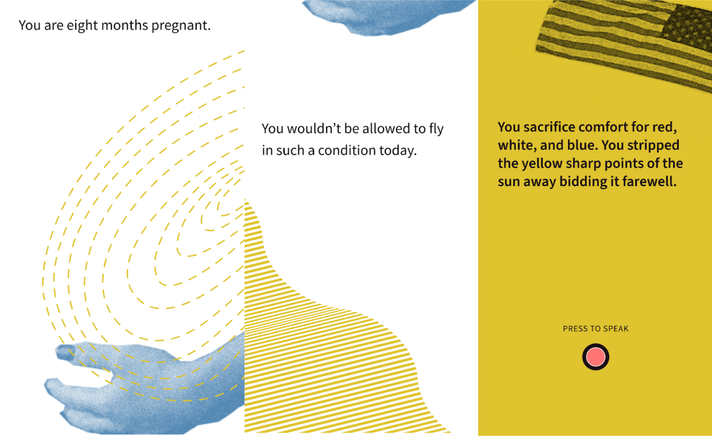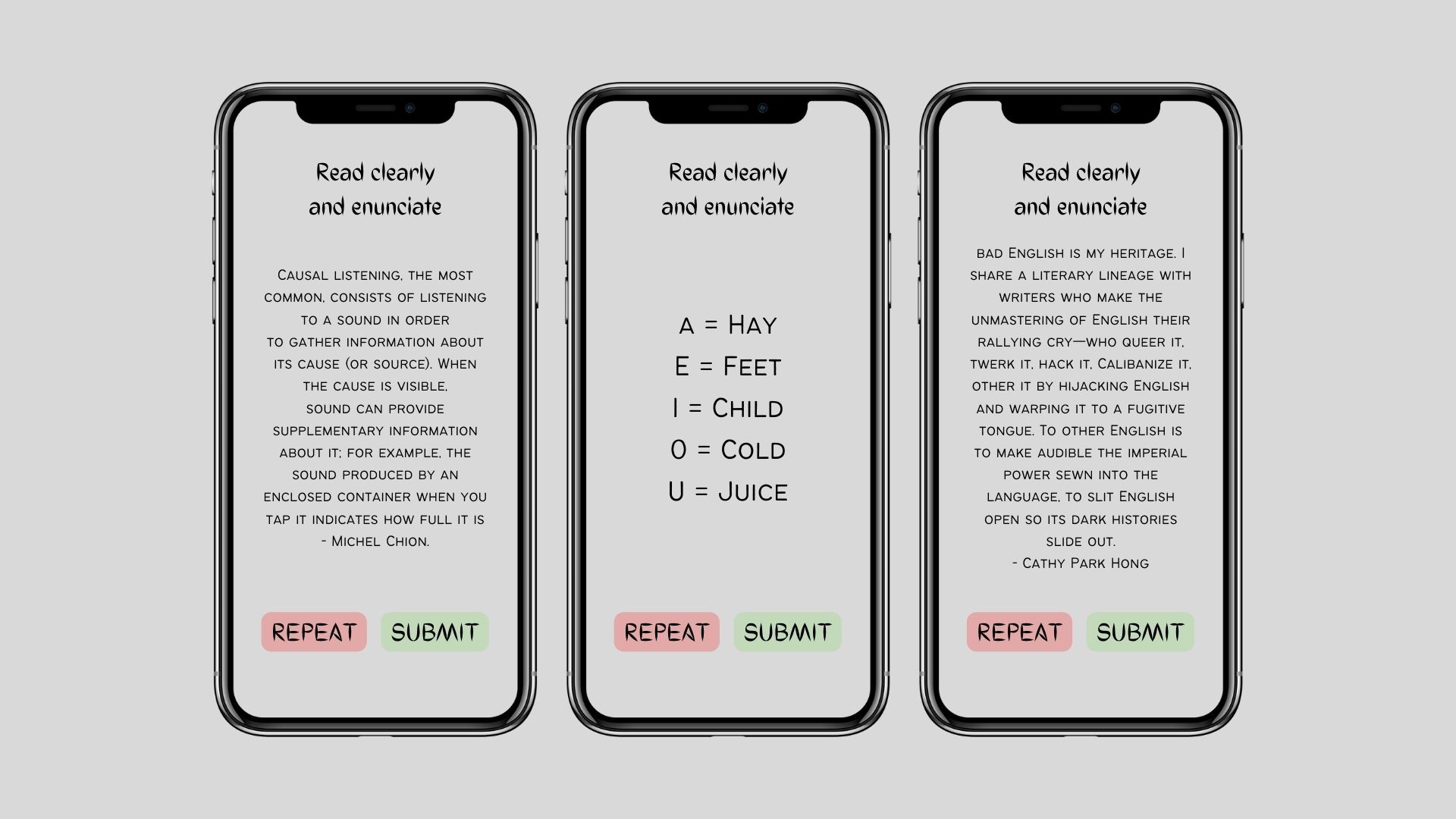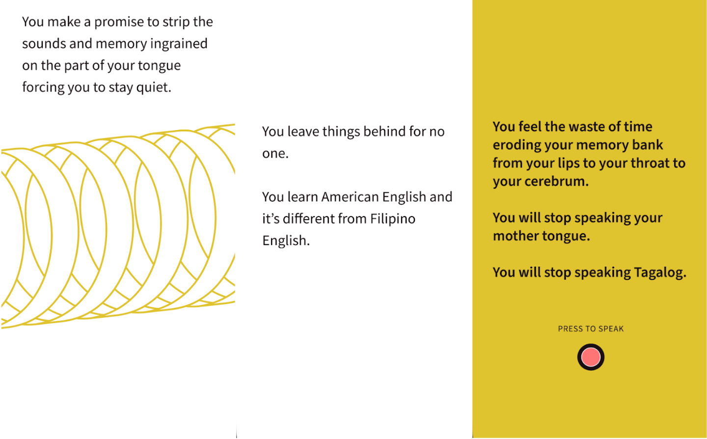 The Cyborg’s Prosody is an interactive docu-poetics artwork designed and optimized for mobile use. Similar to the way a user must validate their voice for various smart technologies, the platform will require the same of the player. For example, this validation entails the player reading excerpts of French film theorist and composer Michel Chion’s work (in English) focused on the disembodied voice or from Cathy Park Hong’s book Minor Feelings. Once a player has completed “voice authentication,” they will be prompted to select the first (and easiest level) of stories. As the stories and levels progress, the player is expected to mimic Tagalog words and phrases to advance in the game.
