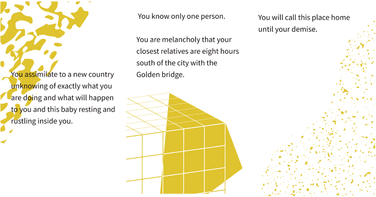 Image description: Work in progress of The Cyborg’s Prosody. The images shown depict excerpts of Level 1 of the game, which includes visual artwork against white and yellow backgrounds with black text. Illustrations by artist Christina Dacanay.