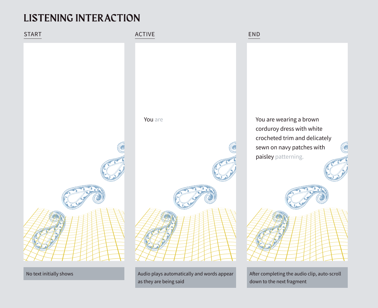 Image description: Phase II mock ups of The Cyborg’s Prosody. The left hand image shows the listening interaction against a white background with black and gray text. The right hand image shows the speaking interaction of the game, which includes a yellow background with a combination of black and white text. Illustrations by artist Christina Dacanay.