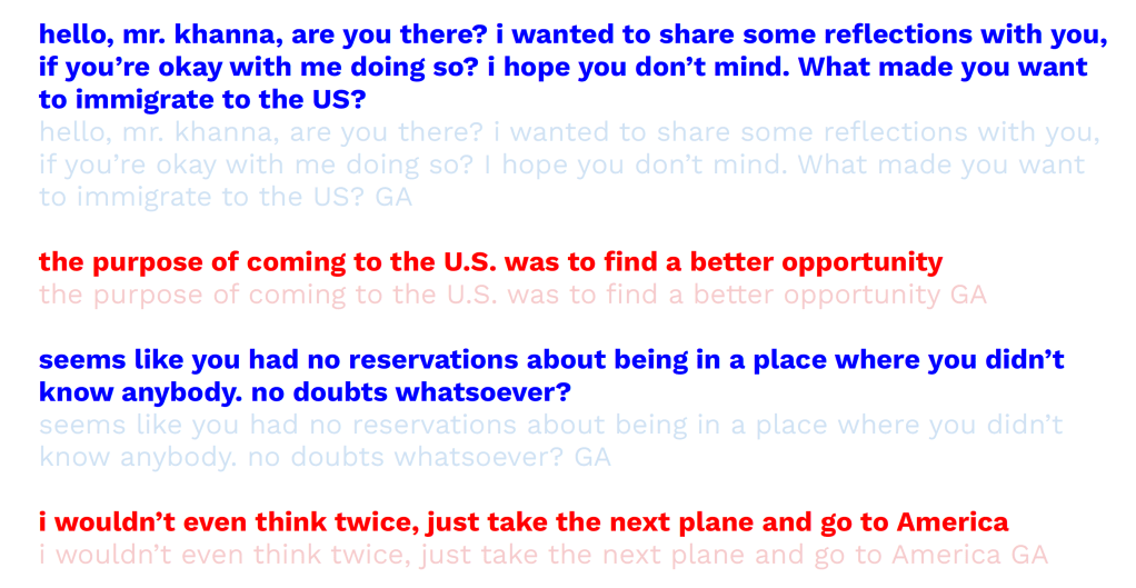 Archival research often yields either discoveries about the social and political landscape or confronting contentious feelings about a particular time in history. During the research and creative process of developing the work, I used constraints to create the work that included watching and listening to the selected oral history while performing a close reading of the approximately 80-page transcript. Then, I selected text I felt may have resonated with my mother’s immigration story to the United States. From there, I pulled Mr. Khanna’s text (depicted in red type) and proceeded to re-cast and re-imagine myself as the interviewer (depicted in blue type). His words are preserved verbatim. Another key constraint is taking into consideration the use of relay operating protocols, which entails keeping text brief and as concise as possible. This work is a result of an experiment in archival research while using a speculative docu-poetic framing to explore concepts of the cultural and technological changes within the Bay Area and perceptions of the Desi and Asian community within Silicon Valley at the emergence of the personal computing age.