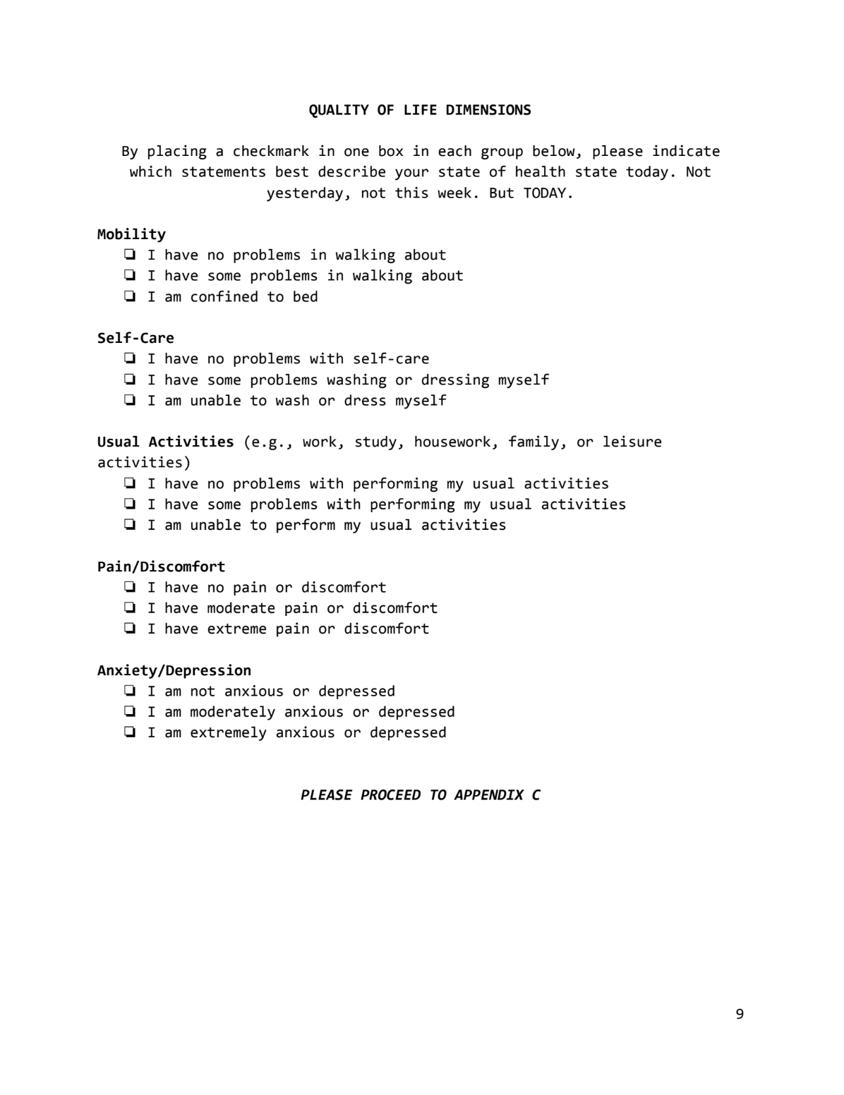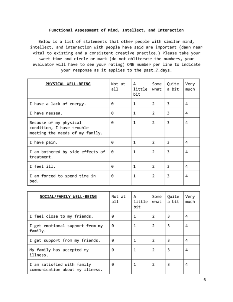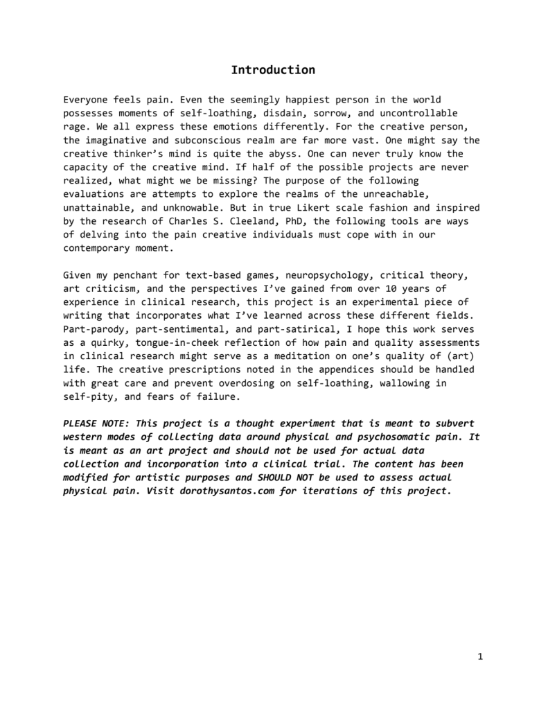 Given my penchant for text-based games, neuropsychology, critical theory, art criticism, and the perspectives I have gained from over 10 years of experience in clinical research, this project is an experimental piece of writing that incorporates what I have learned across these different fields. Part-parody, part-sentimental, and part-satirical, I hope this work serves as a quirky, tongue-in-cheek reflection of how pain and quality assessments in clinical research might serve as a meditation on one’s quality of(art) life. The creative prescriptions noted in the appendices should be handled with great care and prevent overdosing on self-loathing, wallowing in self-pity, and fears of failure.