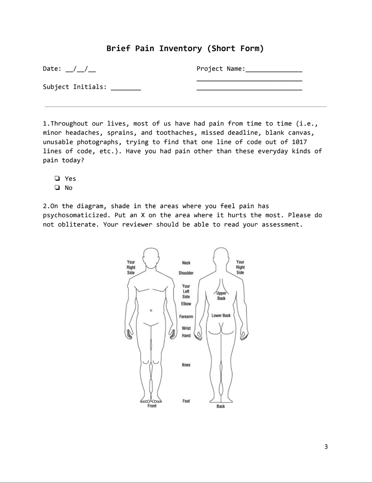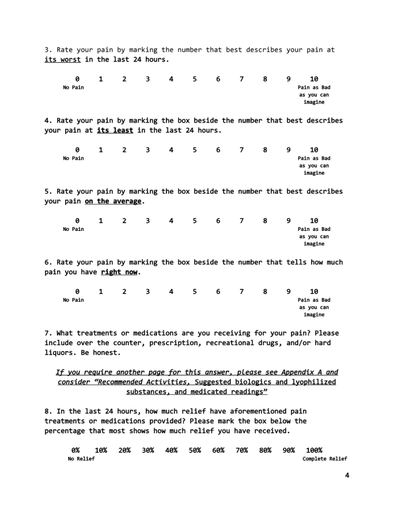 PLEASE NOTE: This project is a thought experiment that is meant to subvert western modes of collecting data around physical and psychosomatic pain. It is meant as an art project and should not be used for actual data collection and incorporation into a clinical trial. The content has been modified for artistic purposes and SHOULD NOT be used to assess actual physical pain.
